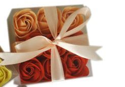 Diese viereckige Geschenkbox hat eine Klarsichthülle und lässt einen Blick auf diese kleinen wunderschönen Rosen zu. Die kleinen Rosenseifen habe eine Größe von 9 x 9 x 5 cm. Die Farben sind Ton in Ton gehalten, in Magenta und Rosa, und die kleinen Seifen duften zart nach Rose.
